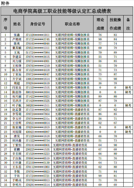 根据潍坊市人力资源和社会保障局、潍坊市教育局《关于公布我市首批驻潍高校高级工职业技能等级认定专业评估论证结果的通知》、《山东省技工院校学生职业技能等级认定工作指引(试行)》有关要求,学校秉持“公平、公正、公开、透明”原则,规范严谨开展2025年高级工职业技能等级认定考试工作。现将山东海事职业学院电商学院2025年高级工职业技能等级认定考试成绩公示如下,公示期为3天(2025年5月21日-23日),如对公示结果若有异议,请在公示期内与教务科研处联系,电话0536-3083665。