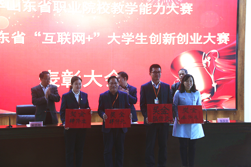 在热烈的气氛中,学院领导对2019年山东省职业院校教学能力大赛获奖教学团队及第五届山东省“互联网+”大学生创新创业大赛获奖团队及指导教师团队等进行了颁奖。