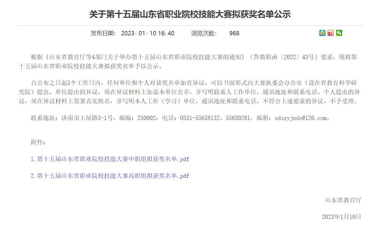 1月10日,山东省教育厅发布《关于第十五届山东省职业院校技能大赛拟获奖名单公示》,学校在大赛中获二等奖1项、三等奖3项。