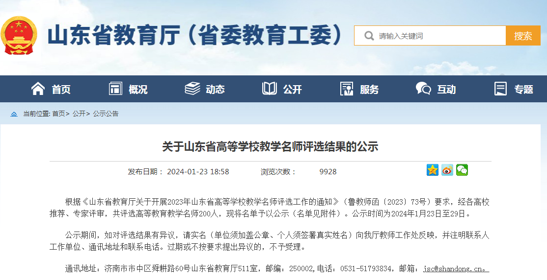 根据《山东省教育厅关于开展2023年山东省高等学校教学名师评选工作的通知》(鲁教师函〔2023〕73号)要求,经各高校推荐、专家评审,共评选高等教育教学名师200人(普通本科院校120名,高等职业院校80名),此次评选活动旨在通过培育选拔一批政治素质过硬、教育理念先进、专业知识扎实、育人效果显著、学术成就突出、勇于改革创新的教学名师,充分发挥教学名师的引领示范作用,带动广大教师践行“四个相统一”,争做“四有”好老师,努力成为高素质、专业化、创新型的高校教师,为高等教育高质量发展提供智力支持和师资保障。