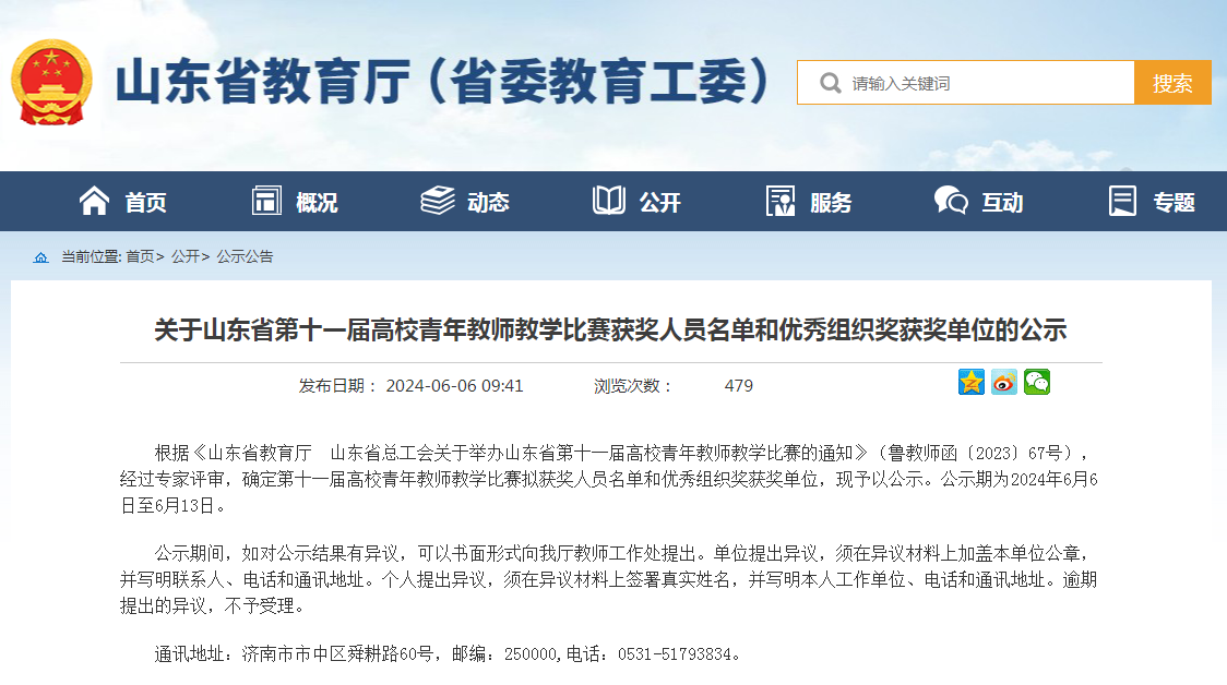 近日,山东省教育厅对第十一届高校青年教师教学比赛获奖人员名单和优秀组织奖获奖单位进行了公示,我校航海学院纪政辉老师获得二等奖,邮轮游艇学院张雪妍老师获得三等奖。