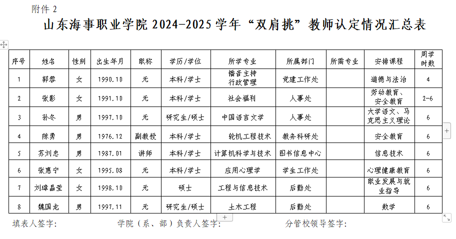 根据《山东海事职业学院关于加强和规范“双肩挑”教师队伍建设的意见》(山海院办字[2023]11号)文件精神,教务科研处组织开展2024-2025学年“双肩挑”教师认定工作。经个人申请、各部门审批、资格审查,现对“双肩挑”教师进行公示。