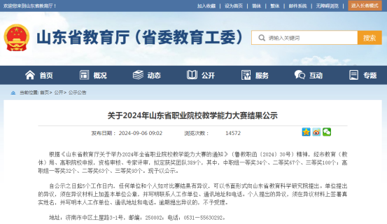 近日,山东省教育厅对2024年山东省职业院校教学能力大赛结果进行了公示,我校教师团队分别获得大赛二等奖1项,三等奖1项。