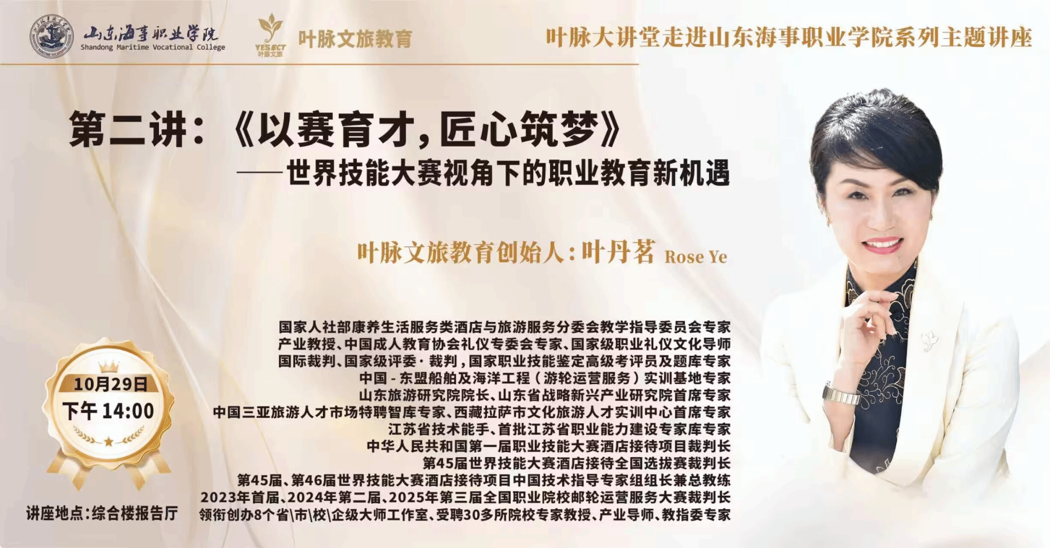 叶丹茗教授深耕职业教育领域多年,拥有诸多重量级身份,既是国家人社部康养生活服务类酒店与旅游服务分委会教学指导委员会专家、产业教授,还是国际裁判、国家级评委及裁判,更是第45届、第46届世界技能大赛酒店接待项目中国技术指导专家组组长兼总教练,在文旅人才培养、世赛国赛执裁、职业培训等方面享有极高声誉。