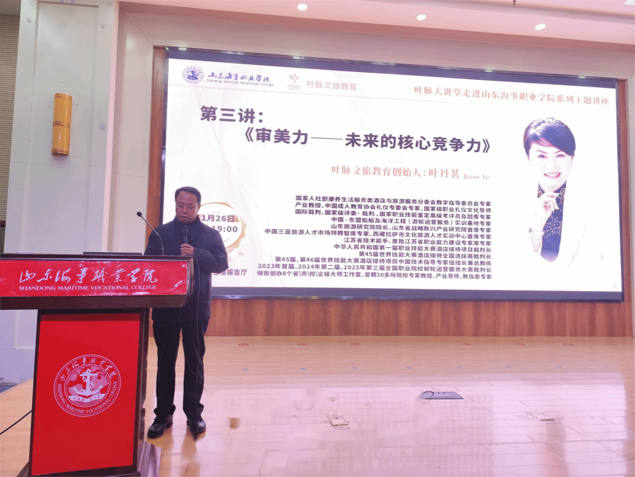 为助力学子塑造未来核心竞争力,丰富校园文化生活,11月26日,一场主题为《审美力——未来的核心竞争力》的专题讲座在我校报告厅成功举办。本次讲座作为叶脉大讲堂走进该校系列主题活动的重要组成部分,由叶脉文旅教育创始人叶丹茗教授主讲,她凭借深厚的行业积淀与丰富的教学经验,为现场师生带来了一场关于审美力的思想盛宴。本次讲座由学校副校长宋志刚主持,三百余名学生参加了此次活动。