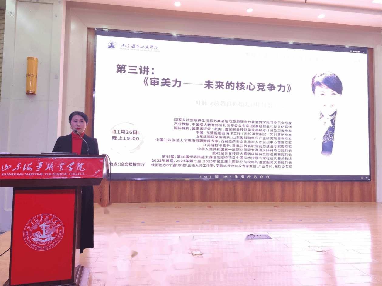 叶教授是人社部康养生活服务类相关分委会教学指导委员会专家、产业教授,是多届世界技能大赛、全国职业院校赛事的裁判长与技术指导专家组组长,领衔创办了8个省、市、校、企级大师工作室,在文旅人才培养、礼仪培训等领域享有极高声誉。此次讲座中,她从审美本质、核心价值、提升路径等多个维度,系统剖析了审美力在当下及未来的重要意义。