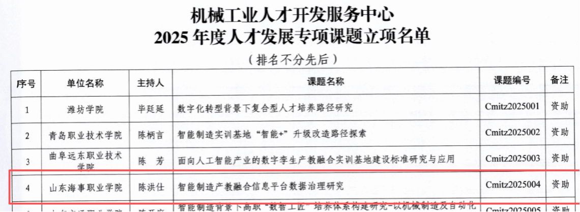 近日,机械工业人才开发服务中心公布了“2025年度人才发展专项课题”立项名单。经专家评审,我校陈洪仕老师主持的《智能制造产数据融合信息平台数据治理研究》(课题编号:Cmitz2025004)、郭彤彤老师主持的《新质生产力导向下新能源装备技术专业“思政铸魂+产教赋能”双驱育人模式研究》(课题编号:Cmitz2025016)、王延壮老师主持的《数字素养下“岗课赛证”育人机制研究》(课题编号:Cmitc2025069)课题获批立项。