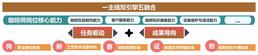 校企协同,融合职业岗位所需知识技能、赛项考点、职业技能等级证书标准、行业四新,重构咖啡调制知识体系,引入真实案例,形成5个模块16个典型工作任务。每个任务对应可评可测的学习成果产出,学生完成任务过程中实现能力螺旋进阶。